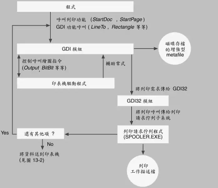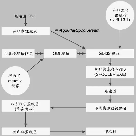| 图13-1 应用程式、GDI模组、列印驱动程式和列印伫列程式的交互作用过程 |