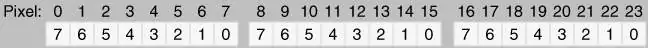 对於每图素1位元的DIB,每位元组对应为8图素。最左边的图素是第一个位元组的最高位元: