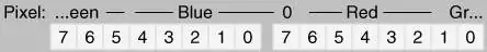 对於每图素24位元的DIB,每个图素需要3个位元组来代表红、绿和蓝的颜色值。图素位元的每一行,基本上就是RGBTRIPLE结构的阵列,可能需要在每行的末端补0以便该行为4位元组的倍数: