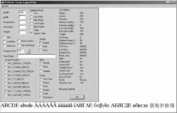在内定的装置内容中选择的字体称为系统字体,能够由GetStockObject的SYSTEM_FONT参数识别。这是调和的ANSI字元集字体。在GetStockObject中指定SYSTEM_FIXED_FONT(我在本书的前面几个程式中应用过),可以获得等宽字体的代号,这一字体与Windows 3.0以前的系统字体相容。在您希望所有的字体都具有相同宽度时,这是很方便的。