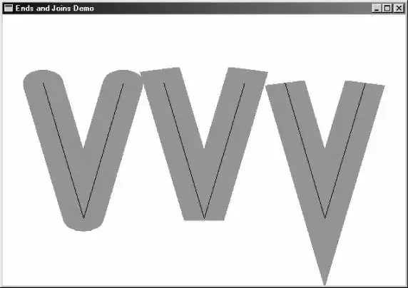 程式使用上述端点和连结点样式画了三条V形的宽线段。程式也使用备用黑色画笔画了三条同样的线。这样就将宽线与通常的细线做了比较。结果如图17-4所示。