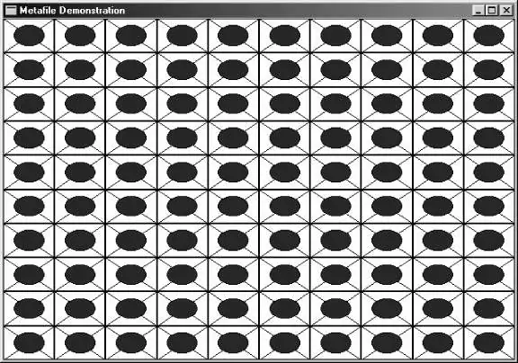 在WM_PAINT讯息处理期间,METAFILE设定一种映射方式并呼叫PlayMetaFile在视窗中绘制物件100次。Metafile中函式呼叫的座标按照目的装置内容的目前变换方式加以解释。在呼叫PlayMetaFile时,事实上是在重复地呼叫最初在WM_CREATE讯息处理期间建立metafile时,在CreateMetaFile和CloseMetaFile之间所做的所有呼叫。