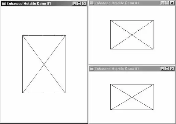 EMF11显示的图像基本上与EMF9所显示的相同。因此,在这里可以看到将SetMapMode呼叫嵌入metafile能够简化metafile的建立,而且不影响以其正确大小显示metafile的机制。
