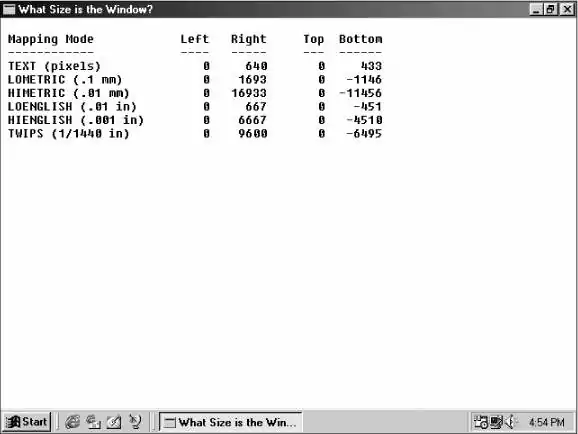您已经看到,Windows内定使用图素座标系统。大多数传统的图形语言使用「虚拟」座标系,其水平和垂直轴的范围在0到32,767之间。虽然有些图形语言不让您使用图素座标,但是Windows GDI允许您使用两种座标系统之一(甚至依据实际度量衡的座标系)。您可以使用虚拟座标系以便让程式独立於硬体之外,或者也可以使用设备座标系而完全迎合硬体设备提供的环境。