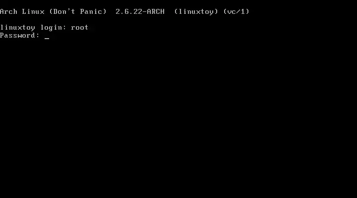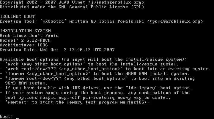 假设您下载了 archlinux-2008.06-core-i686.iso ,刻录并使用它引导,您会看到以下界面