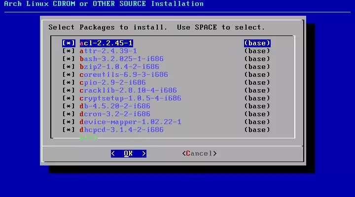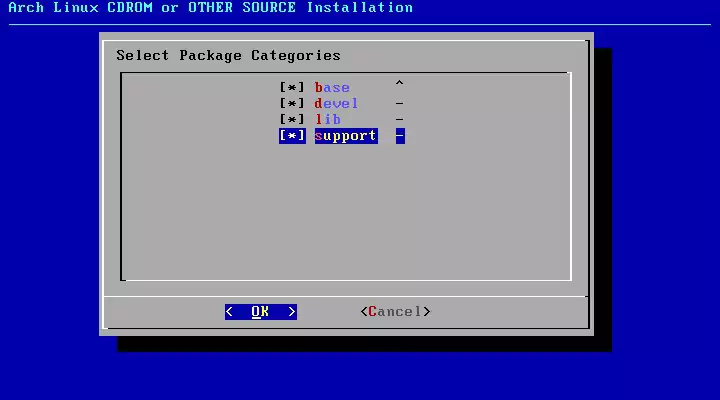 使用空格键 标记/取消标记。当 Archlinux 安装程序提示你是否默认选中所有的包时,按 Yes 后会进入已标记分类包含软件的选择菜单,完成后按 OK 确认。