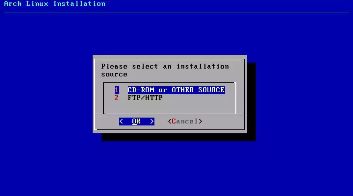 接下来选择要安装的软件包。Archlinux 首先会要求选择安装介质,因为我们是从 CD-ROM 进行安装,所以保持默认。然后,我们选择 CD 驱动器,仍然默认。最后,选择软件包